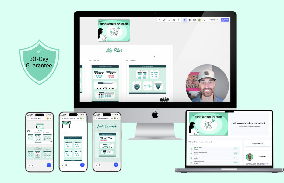 The Productizer Co-Pilot is divided into 3 sets of activities that you'll complete in your own private, secure, digital workbook.The activities use carefully-crafted prompts and thought-provoking exercises to short-circuit your imposter syndrome, produce aha moments, and unveil product ideas that feel like bolts of lightning.You'll also have instructional videos and examples to support you throughout.Within hours, you'll have viable ideas to package and monetize your skills, and a go-to-market plan.